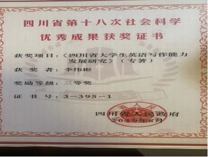 出版四川省大学生英语写作能力发展研究》《四川省旅游公示语英译标准化指南》《实用英语写作等》专著,翻译《市场之表示法》《中国养老保障体系》《空中移动的箱子——国际航空货运经济学》《毛泽东家风》《信念之子:雷锋》《中国电影史》《中国都市圈发展之路》《中国青海》《大国之治》《话说中医》《中国知识产权行政管理》《中国扶贫:从闽宁振说起》《中国高铁发展纪实》《通江达海:南通》《绿色发展改变中国》等著作20余部,承担“四川省公共标识语双语语料库及平台建设”、《习近平话语体系双语平行语料库及平台建设》等四川省科技厅、社科联省部级项目15项,获得科研经费200多万元。团队成员多次获得校内外教学大赛奖励,其成果荣获四川省政府哲学社会科学优秀成果奖。
