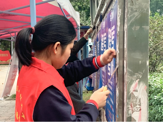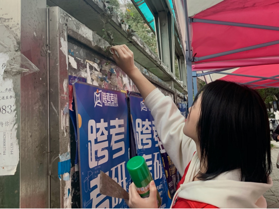 分会副会长的带领下多名志愿者在校园内开展校园铲除小广告活动。本次活动在清除校园小广告的同时也为初冬校园增添了一抹亮色。