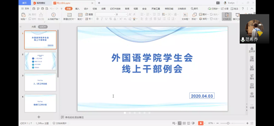 在此次线上会议中,学生会干部们汇报工作,对接下来的安排进行了构想。在这特殊的时期,学生会全体成员仍然会维持正常工作,并共同为家国祈愿。