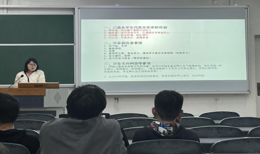 王老师对毕业前注意事项进行说明,着重强调英语四、六级,专业四级,重修课程,体测,创新学分,论文撰写与答辩等对能否顺利毕业的影响。就业方面,王老师提醒同学们应谨防求职陷阱,对学院、校友、老师对毕业生就业提供的帮扶做了详细说明,为准备参加考研复试的同学提供了考研复试指导会的相关信息。