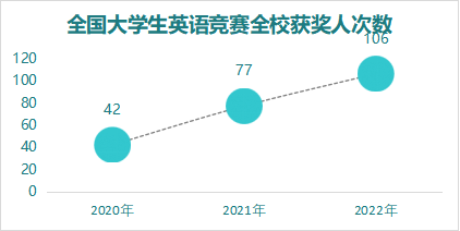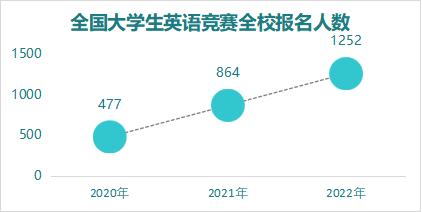 竞赛方面:学院学生绝大多数都参加过至少一次各类竞赛;学院组织竞赛的全校参赛人数也越来越多。以全国大学生英语竞赛为例,2020年全校报名人数为477名,2021年全校报名人数为864名,2022年全校报名人数增加到了1252名。2019年听书网