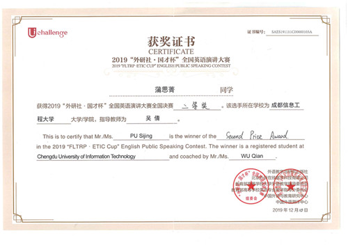 吴倩老师同时荣获2019“外研社·国才杯”全国英语演讲大赛全国决赛指导二等奖。