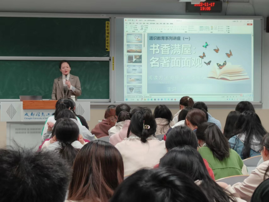 讲师、英国三一圣大卫大学博士研究生安丽娅老师,在航空港校区四教202举办通识课系列讲座(一)“书香满屋:名著面面观”。本次讲座一个半小时,主要是面对2022级全体大一新生。安老师从通识课教育的常识入手,向新同学们宣传了大学开通识课的意义和价值。通过举哈佛大学反思自身教育弊病的例子,提出大学教育,尤其是通识教育的重要目标和宗旨是通过培养学生的人文精神,来培育学生健全的人格。由此引出通识教育和广泛阅读的关系、读经典书籍的必要性以及读书的方法。在读书的方法部分,用了宋代学者陆九渊的《读书》一诗来进行说明。在读书的必要性中,安老师结合电子时代、读图时代的特点,对同学们碎片化阅读习惯养成的危害性,手机阅读信息来源的不可靠性做了分析。对比对照下,书籍的权威性和系统性才有利于对自身知识结构的建设和完善。另外,从四个方面阐述了读书的意义:训练我们的专注力;保护并促进我们的想像力;帮助我们形成“移情”能力;帮助我们渡过人生的困厄。同时用了《诗经》、《红楼梦》以及网络小说的三重例证,详细阐述了以上四点。最后给同学们推荐了十本中外优秀书籍,增强了同学们对读书的兴趣,引导大家读好书、读经典。讲座结束后,同学们反映良好,与安老师积极互动、友好交流,并表达了继续跟随学习的愿望。