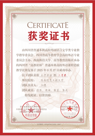 石倩、舒琴、周敏、段蓉、熊成5名教师组成的团队经过初赛选拔,与全省22支队伍进行复赛角逐,最终获得省级(大学英语组)二等奖。