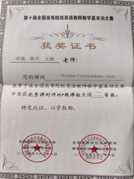 基本功大赛微课组别中,安丽娅、胥婷、陈琴教师团队的作品《The Power of Precision: Unpacking Hyponymy》,孙假梦、付译婷教师团队的作品《口译中的记忆机制》分别荣获全国一等奖;李旭刚、张红琼、唐艳教师团队的作品《How to use parallel structures more effectively?》,胡璐、陈丹、王娟教师团队的作品《Business Correspondence: Email》分别荣获全国二等奖;饶国慧、黄舒、邓圆教师团队的作品《English Hyponyms》荣获全国三等奖。基本功大赛实录课组别中,饶国慧老师的作品《Unit1 Text A What Can Americans Learn from Confucianism?》荣获全国二等奖。在英语教学优秀学术论文评选方面,陈琪老师的教学研究论文《Construction of the “Dual-track Parallel” Paradigm for Ideological and Political Education Content in English Courses of New Engineering Education》荣获全国二等奖。