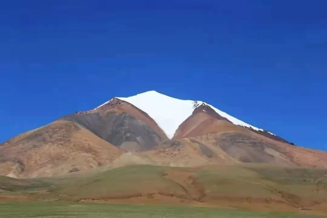 这幅作品构图规矩,画面干净,白色的雪山顶,黄灰色的山坡,绿色的山底将画面分割成几个色块,相辅相成,视觉上来说非常和谐。